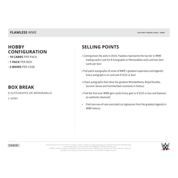 - Coming down the aisle in 2024, Flawless represents the top tier in WWE trading cards! Look for 8 Autographs or Memorabilia cards and two Gem cards per box!