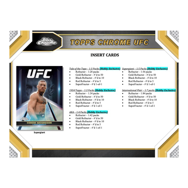 Brace yourselves for a knockout experience with the return of the 2024 Topps Chrome UFC Hobby Box! Get ready to dive into a world of autographs, inserts, refractors, and chases that will have you at the edge of your seat. The octagon is set, the crowd is buzzing, and Topps Chrome UFC is here to bring the ultimate thrill to your collection!