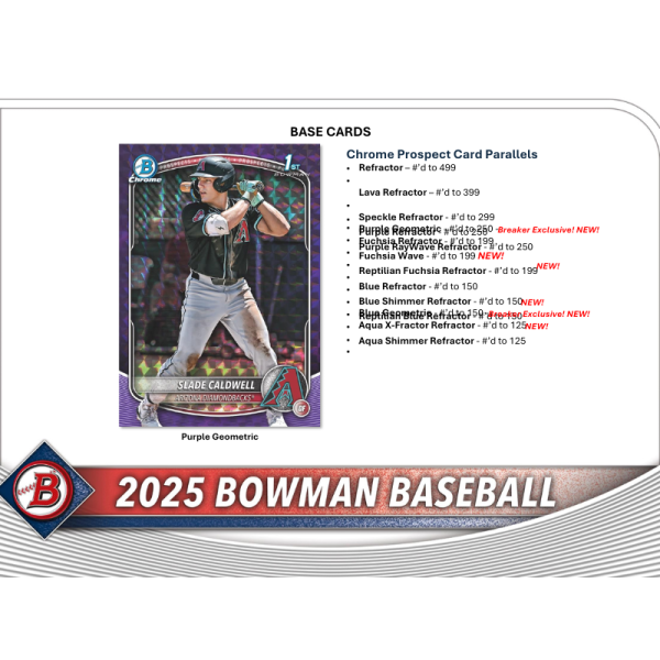 – Look for Bowman Variety Packs that fall randomly in boxes of 2025 Bowman Baseball.